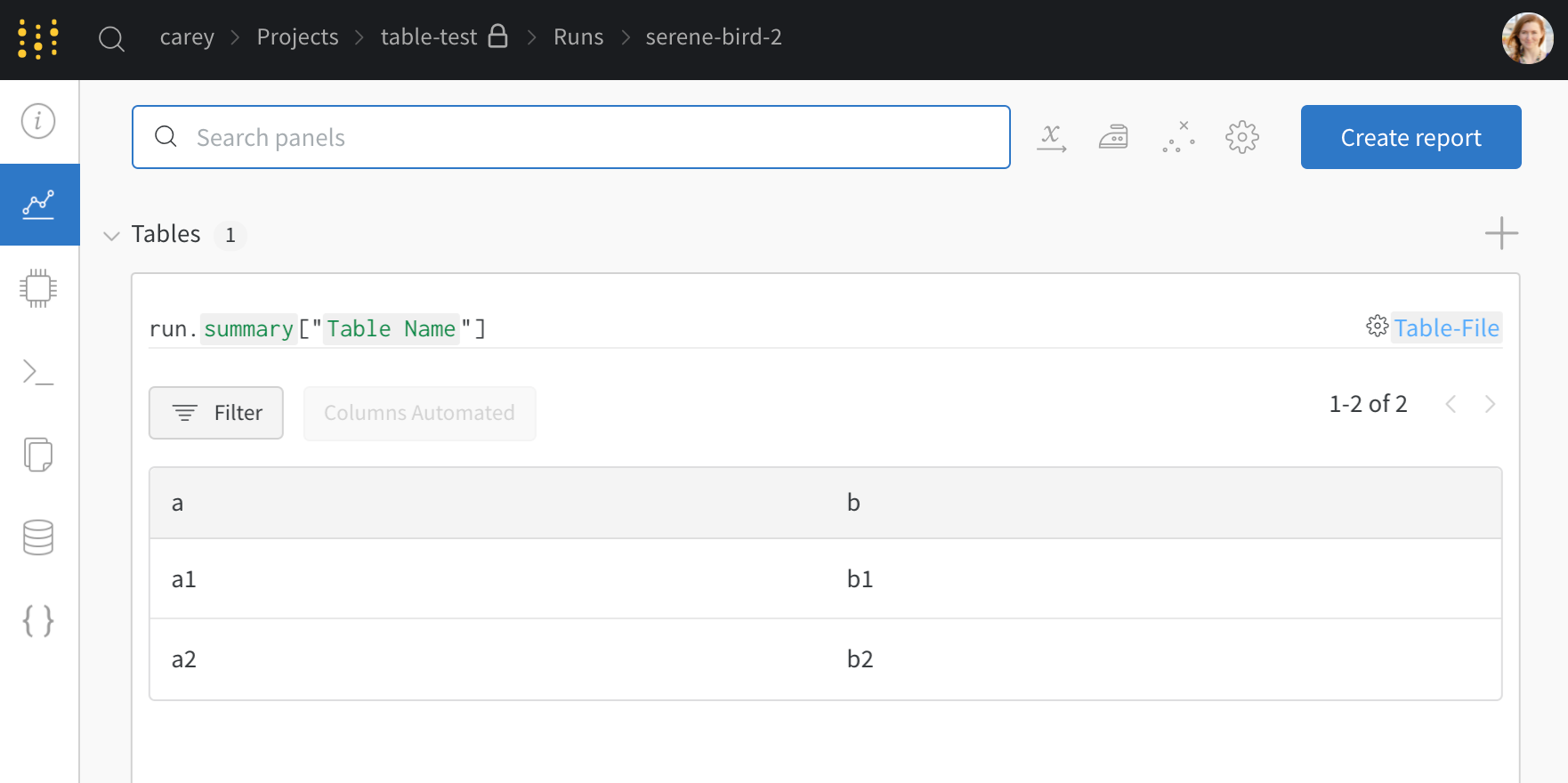 2. 프로젝트 워크스페이스에서 run 이름을 선택합니다. 각 고유한 테이블 키에 대해 새로운 패널이 추가됩니다.